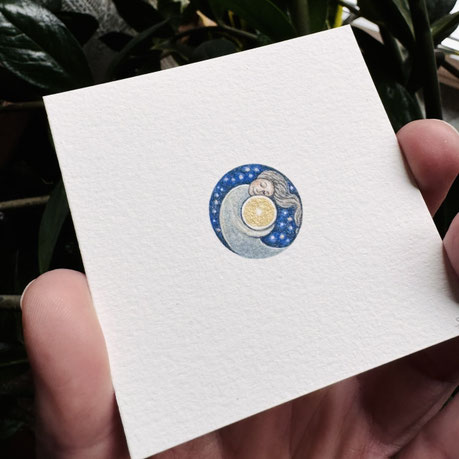 - Formate: ca. 10 x 10 cm oder 9 x 9 cm Bildformat, Aquarell-Malerei ist 2 cm klein